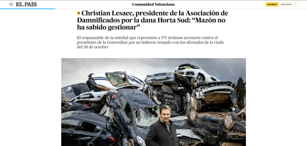 Podéis leer la noticia completa en el siguiente enlace bajo suscripción al diario: https://elpais.com/espana/comunidad-valenciana/2025-01-21/christian-lesaec-presidente-de-la-asociacion-de-damnificados-por-la-dana-horta-sud-mazon-no-ha-sabido-gestionar.html