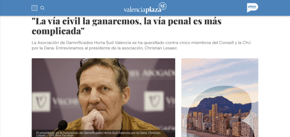Podéis leer la entrevista completa en el siguiente enlace: https://valenciaplaza.com/valenciaplaza/valencia/damnificados-querella-consell-CHJ-Dana-Valencia